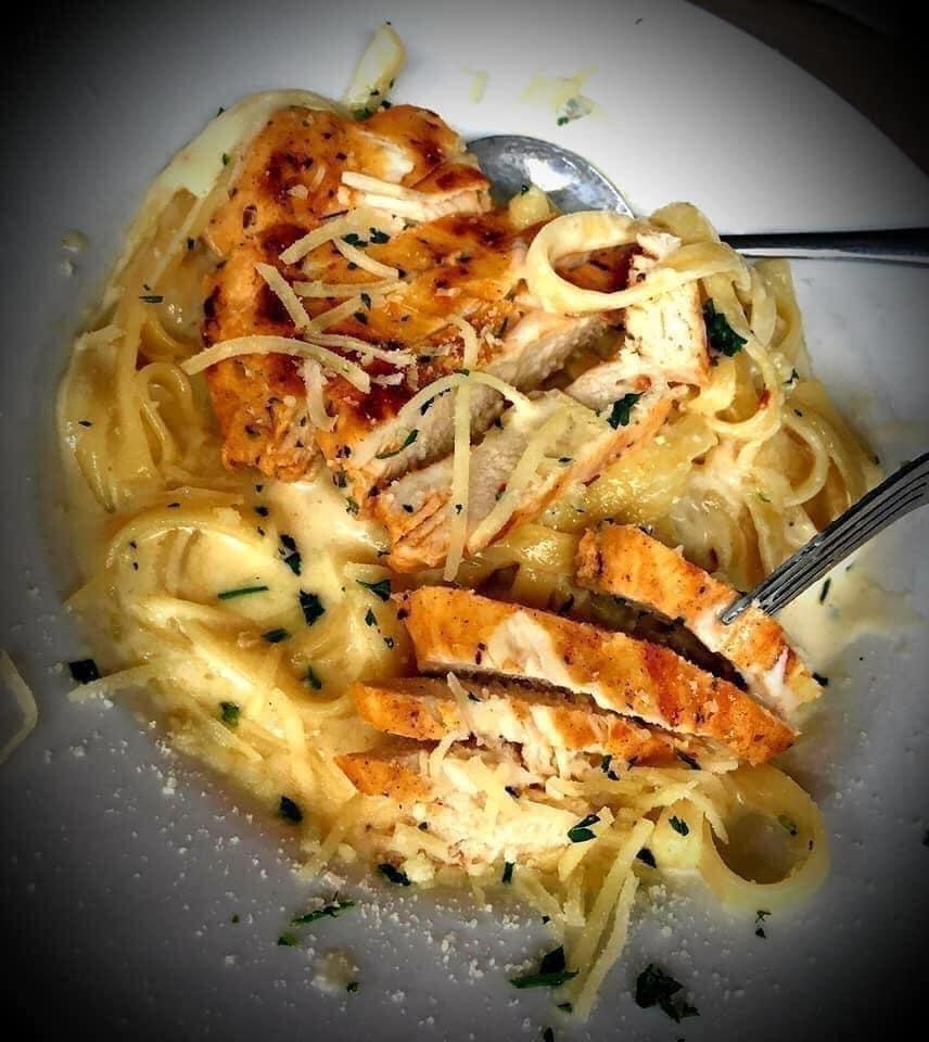 SignatureOur namesake dish — silky ribbons of fresh pasta tossed in a rich, creamy Alfredo sauce with tender grilled chicken.
